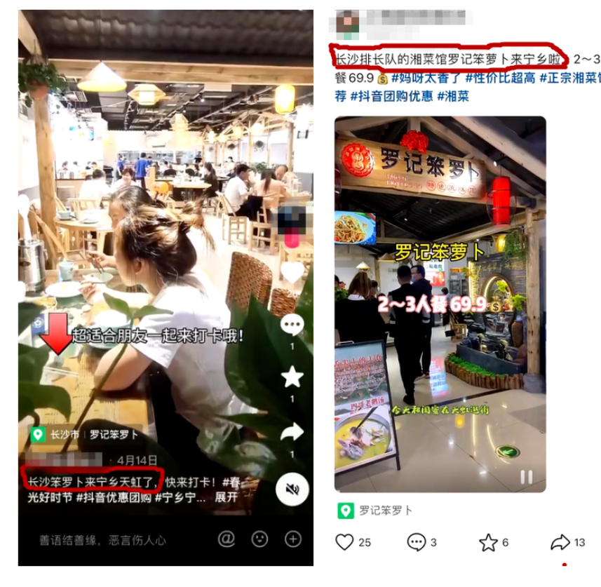 2022年8月,被告罗某成立了宁乡罗记笨罗卜餐饮店,其店内的店招、宣传牌、点餐码均使用了“罗记笨罗卜”标识。抖音博主在宣传该店时使用了“长沙排长队”“火爆长沙”“长沙笨罗卜来宁乡天虹了”等字眼,并关联了被告抖音账号的团购套餐,面对博主提出怎么想到把笨罗卜开到宁乡的提问,被告也没有否认这种提法。