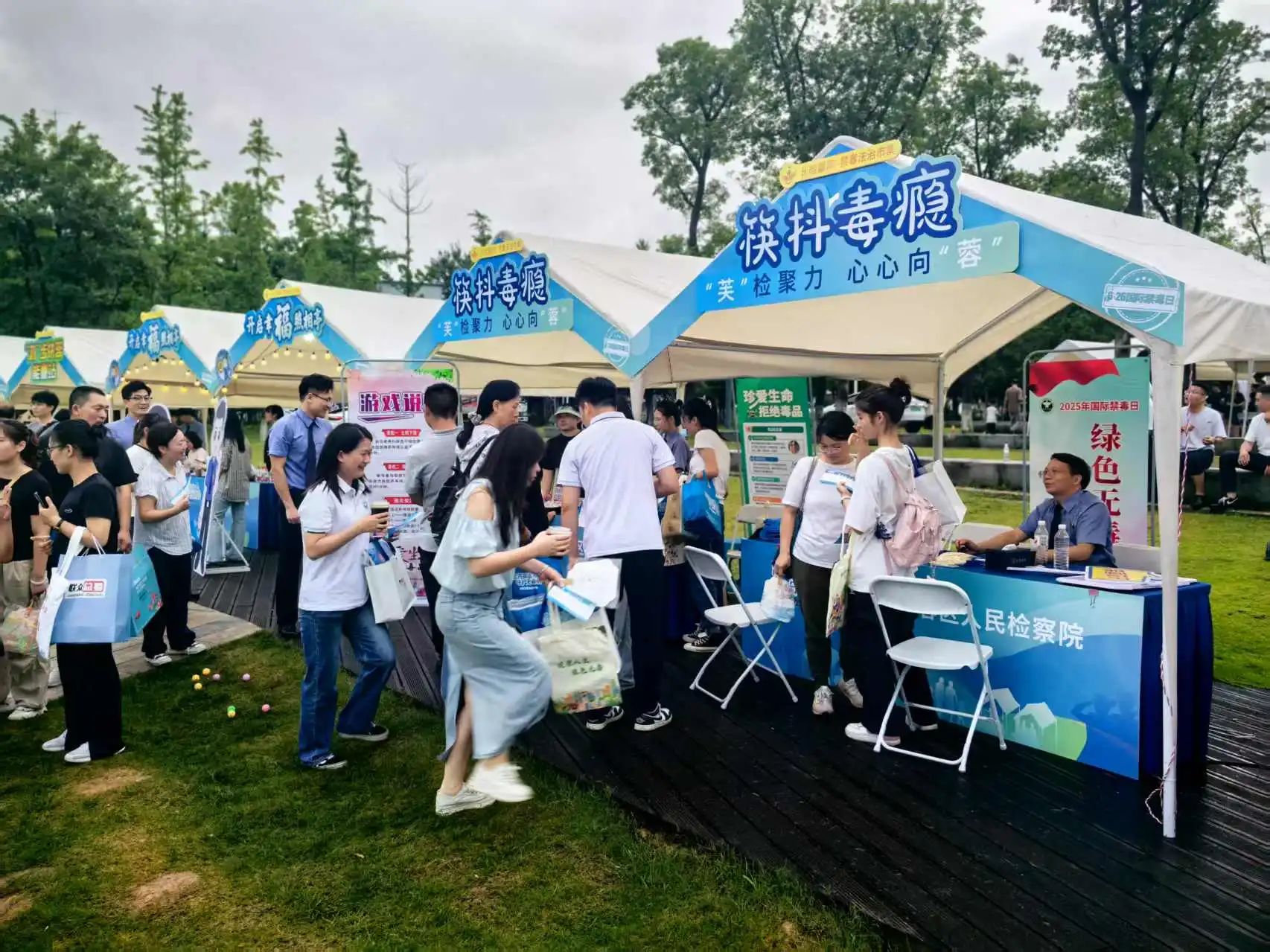 芙蓉区人民检察院支起的“‘芙’检聚力 心心向‘蓉’”摊位,检察干警化身“禁毒摊主”热情引导“客人”参与游戏,发放精心编制的图文并茂的宣传手册、书签和购物袋。