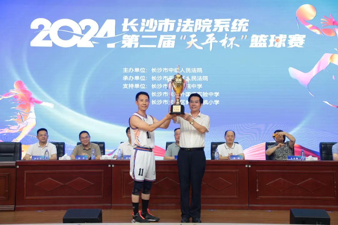 随后,首届“天平杯”篮球赛冠军得主“长沙市中级人民法院代表队”携冠军奖杯上场,进行“天平杯”冠军奖杯交接仪式。