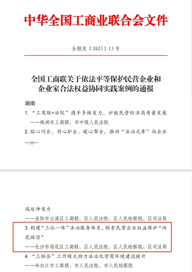 近日,中华全国工商业联合会印发《关于依法平等保护民营企业和企业家合法权益协同实践案例的通报》,对市县级人民法院、人民检察院、司法行政机关、法学会和工商联在依法协同维护民营企业和企业家合法权益过程中,形成的一批具有示范意义和推广价值的协同实践案例进行通报。其中,雨花区工商联、区法院、区检察院、区司法局申报的《构建三位一体法治服务体系探索民营经济权益保护“雨花路径”》典型做法成功入选。