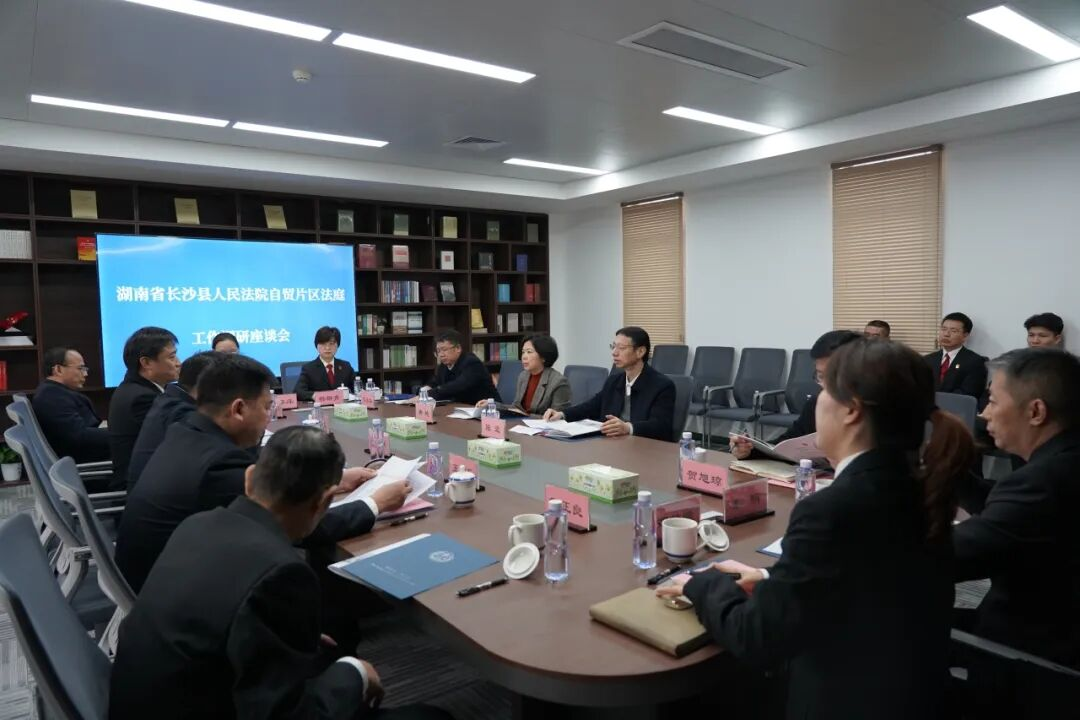 湖南高院、长沙中院、县委政法委主要领导一行对自贸片区法庭进行了调研指导,并围绕助力自贸片区建设发展、优化自贸片区司法服务及加强自贸片区法庭建设等内容展开座谈。
