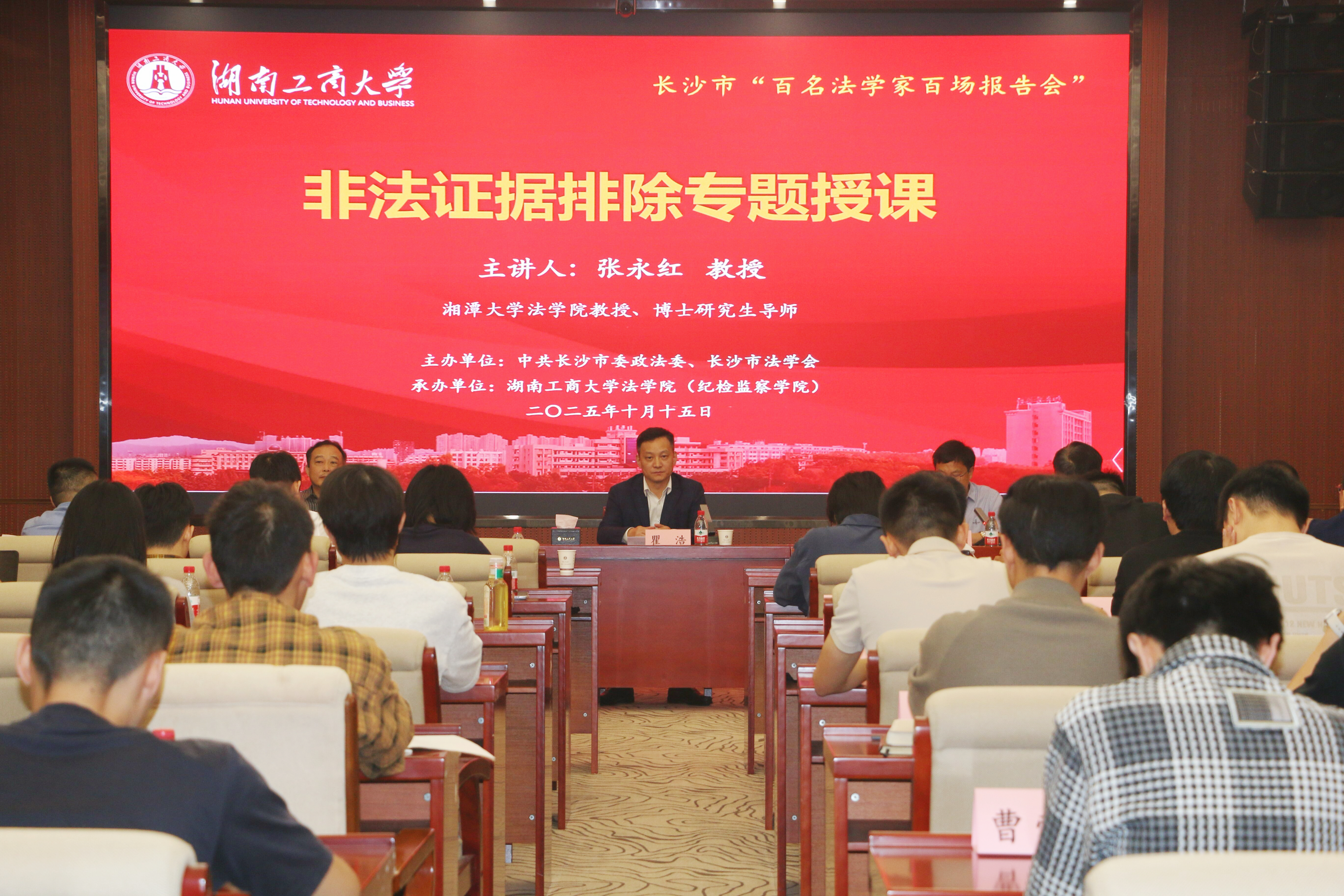 10月15日,中共长沙市委政法委员会、市法学会联合举办长沙市2025年“百名法学家百场报告会”法治宣讲活动,市委政法委副书记、市法学会常务副会长瞿浩出席并致辞。湘潭大学张永红教授作专题宣讲。湖南工商大学法学院院长刘期湘主持活动。全市政法系统代表及高校师生200余人参加。